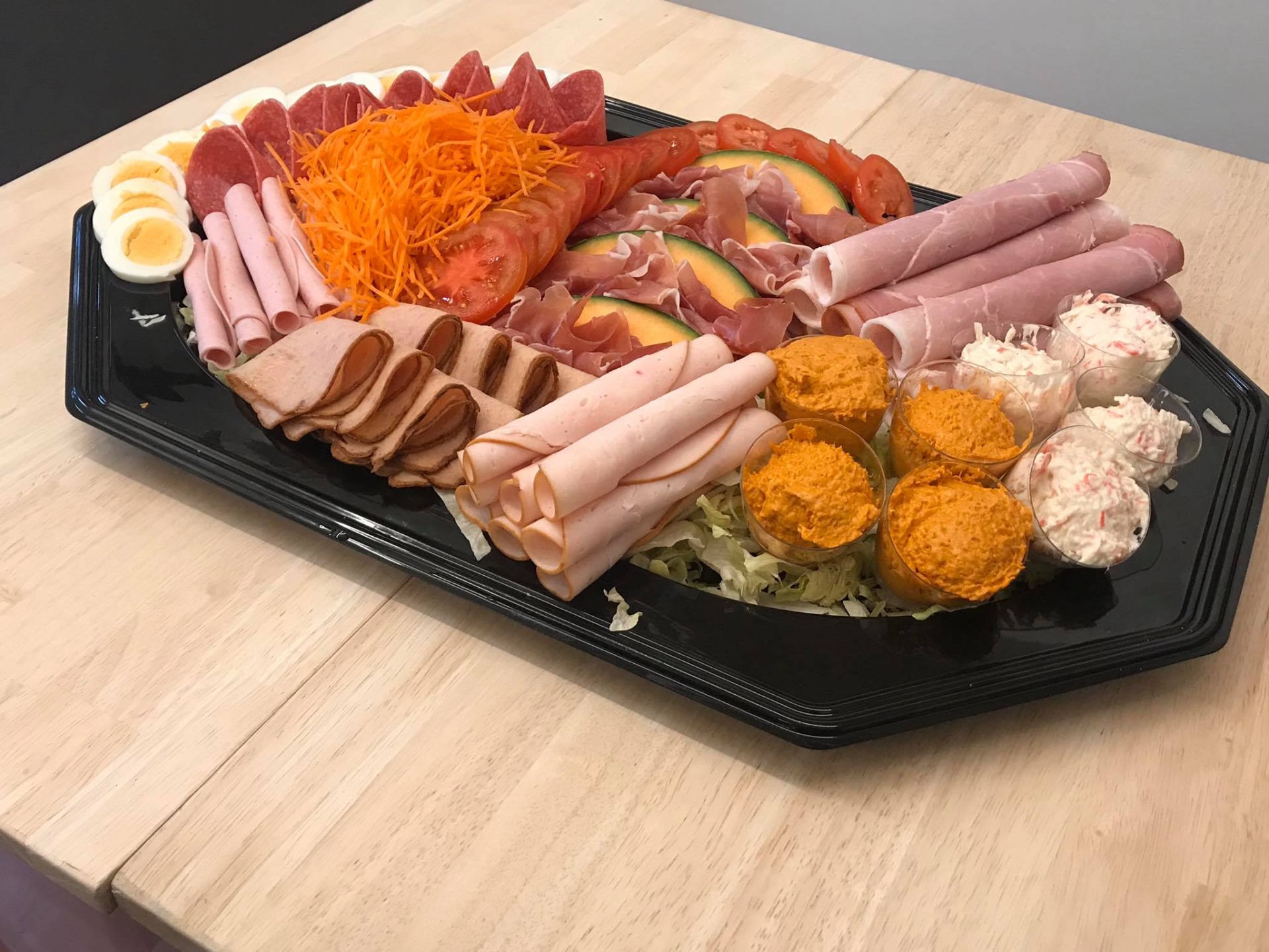 Charcuterieschotel afgewerkt met 8 soorten charcuterie en verse groentjes.Met 5 broodjes en 2 boterporties per persoon.